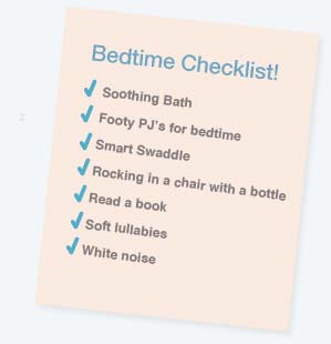 A repetitive, calming routine is the key to restful sleep for babies. The repetition of a routine tells baby that there are things in his life that he can count on, anticipate, and trust. Utilizing the routine of voice, person, time schedule, and activities will give your baby the sense of comfort and security he needs to relax.