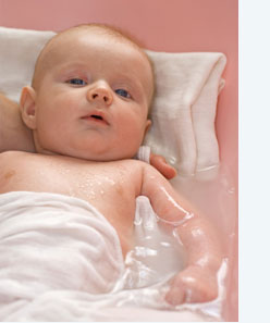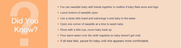 For very sensitive babies, I recommend actually using a dishtowel to swaddle baby. Don’t be afraid to dip baby into the bath, towel and all.